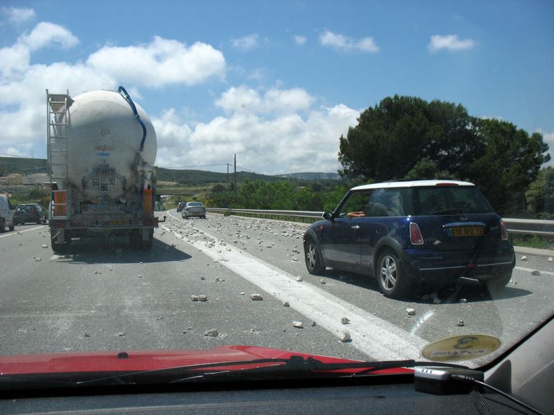 Das passiert, wenn ein LKW seine Ladung verliertGlücklicherweise waren es nur Steine und keine Senfgläser. |