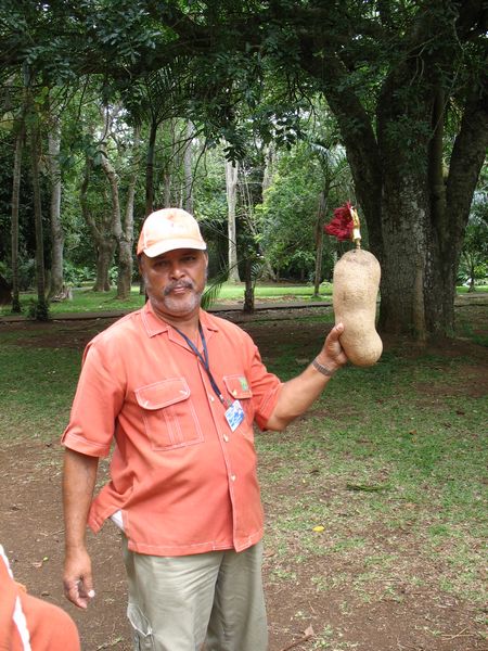 Im botanischen Garten von PamplemoussesUnser Führer mit einer Kalebassenfrucht. Leider habe ich die Geschichte, die er dazu erzählt hat, vergessen. |