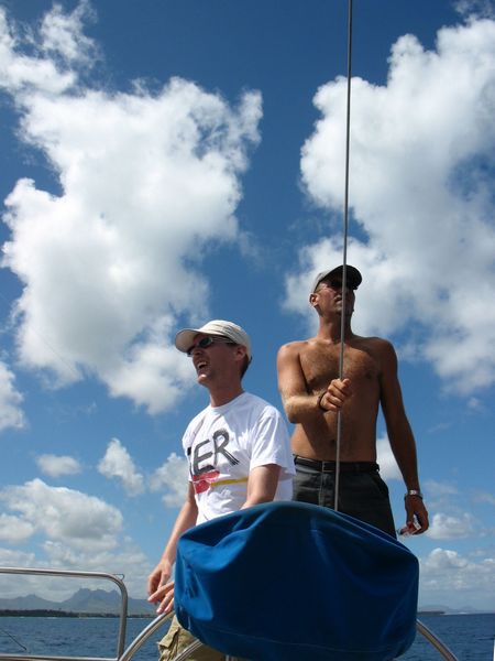 Wir segelnMac hat einen Segeltörn organisiert, da er den Bootsbesitzer, einen aus der Bretagne ausgewanderten Franzosen, kennt. Hier sieht man Mac und unseren Steuermann (oder was immer er war). |