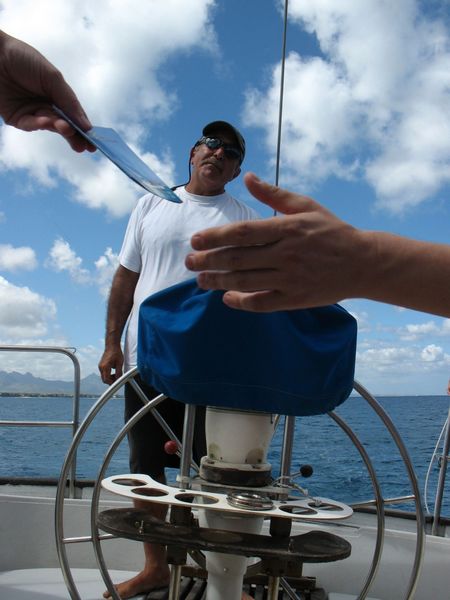 Hier noch mal unser Kapität und Bootsführer. Im Vordergrund: Dubiose Geschäfte.