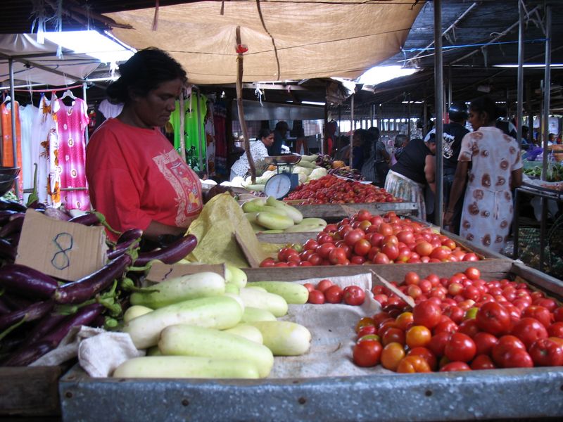 MarktDie "8" links im Vordergrund ist der Preis für eine Aubergine - in Rupies. Ca. 40 Rupies entsprechen 1 €. |
