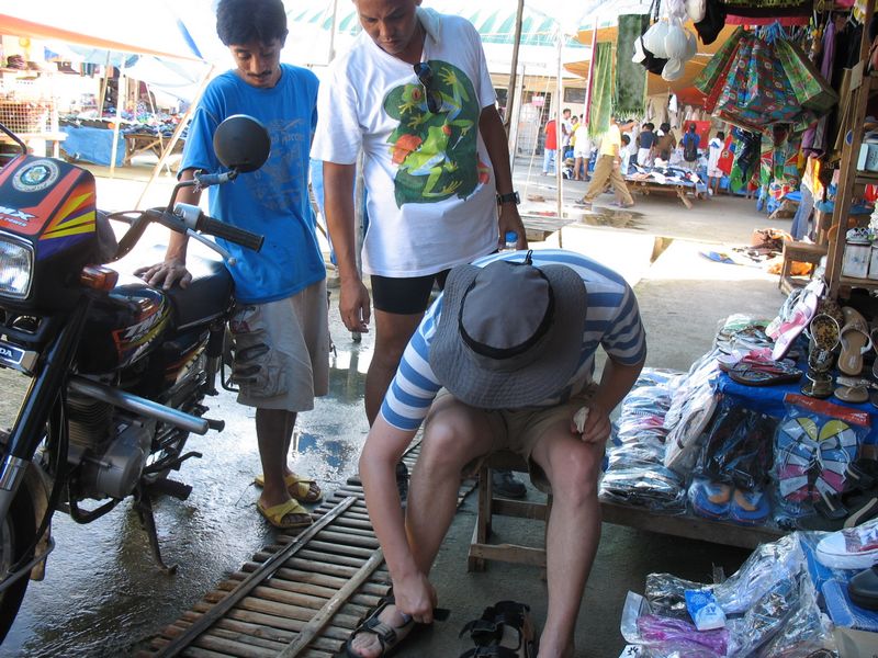 Schuhe kaufen...Aufgrund einer kleinen Verletzung brauchte ich Sandalen, deren Bänder nicht gerade über der verletzten Stellen lagen. Mit Dorfpolizist Peter (im weißen T-Shirt) ging's auf den Markt, zum Schuhe kaufen. |