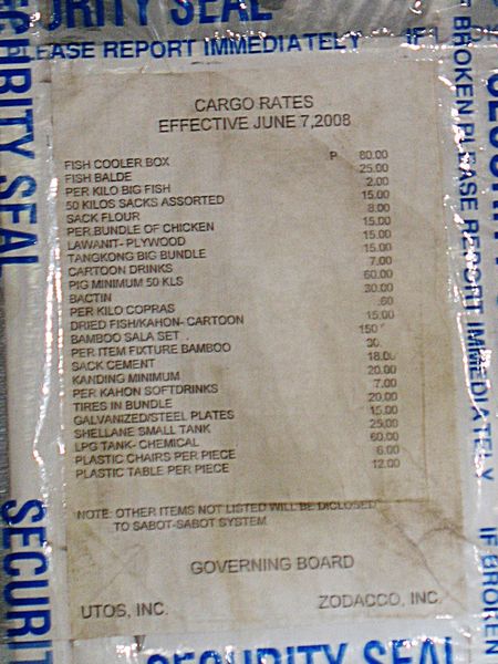 Fahrpreise im JeepneyHier die Preisliste für die verschiedenen Dinge, die man im Jeepney so mitnehmen möchte. Z.B. 60 Pesos für ein Schwein von mindestens 50 kg. |