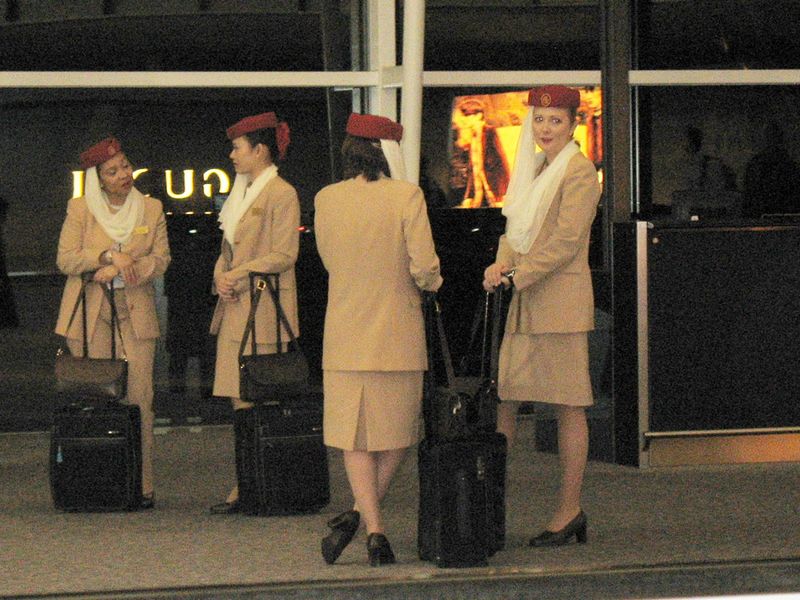 Umstieg in HongkongDas sind die Damen der Fluglinie Emirates mit ihren lustigen Hütchen. Mit denen sind wir aber nicht geflogen. (Zwei Jahre später, anläßlich des Emirates-Fluges nach Indien, haben wir dann erfahren, dass sie die Hütchen nach dem Start ablegen. Dann sehen sie wieder aus wie ganz normale Stewardessen...) |